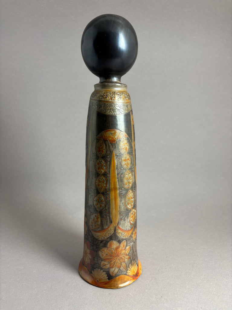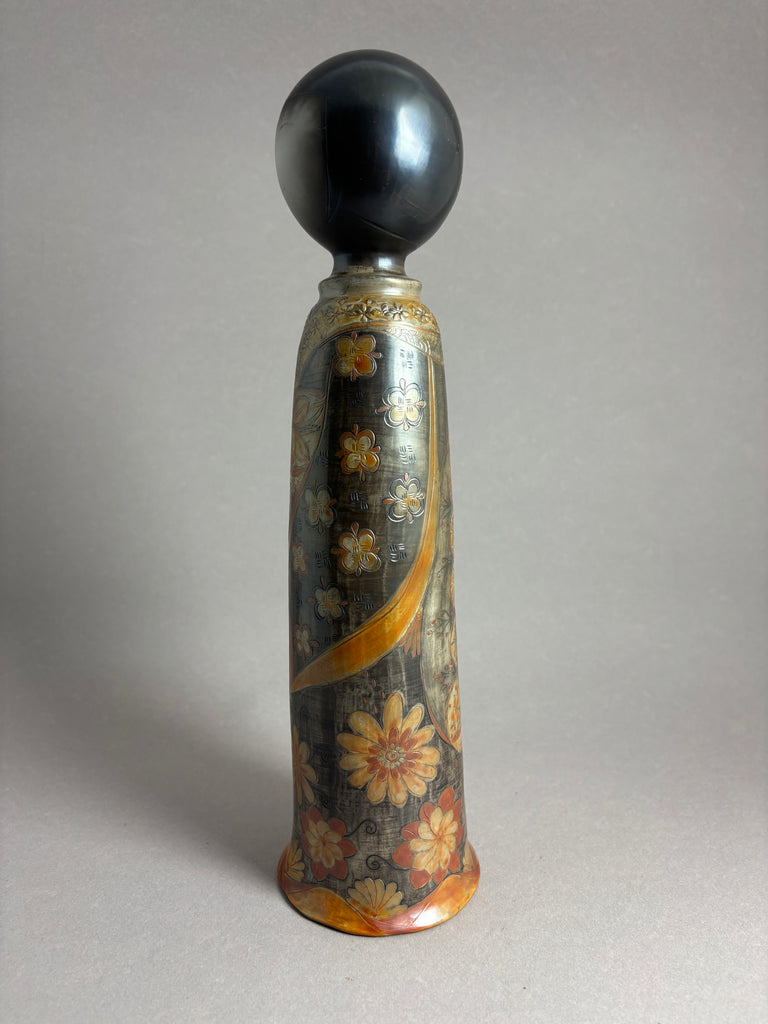 Technique : Pièce unique réalisée depuis la forme, le polissage, la gravure, la cuisson et l'enfumage par moi-même dans mon atelier. Je grave avec une petite pointe en métal les visages, les kimono de mes kokeshi, chacune a son histoire, chacune est unique. Je fabrique mes sigillées, un revêtement argileux qui vitrifie à la cuisson, c'est ma palette naturelle. Les étapes sont nombreuses et très soignées pour donner une âme à mes kokeshi.