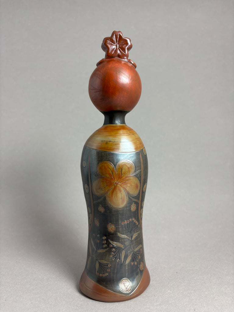Technique : Pièce unique réalisée depuis la forme, le polissage, la gravure, la cuisson et l'enfumage par moi-même dans mon atelier. Je grave avec une petite pointe en métal les visages, les kimono de mes kokeshi, chacune a son histoire, chacune est unique. Je fabrique mes sigillées, un revêtement argileux qui vitrifie à la cuisson, c'est ma palette naturelle. Les étapes sont nombreuses et très soignées pour donner une âme à mes kokeshi.