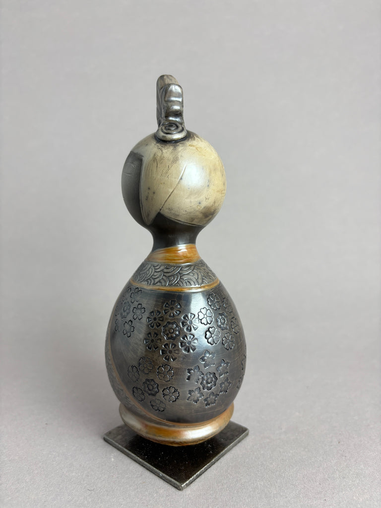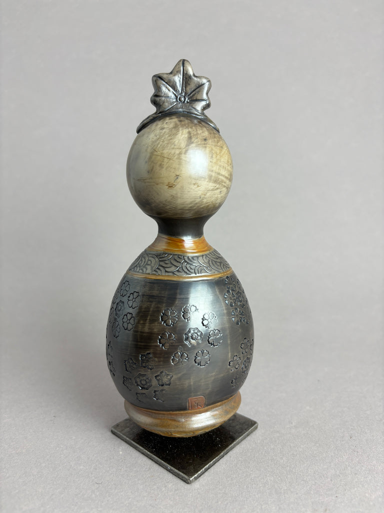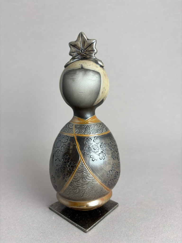 Description : Kokeshi goutte gris foncé et gris clair métallisé. Motif seigaiha gravé et empreintes de petites fleurs. Coiffe Momiji (feuille d'érable). Socle métal.