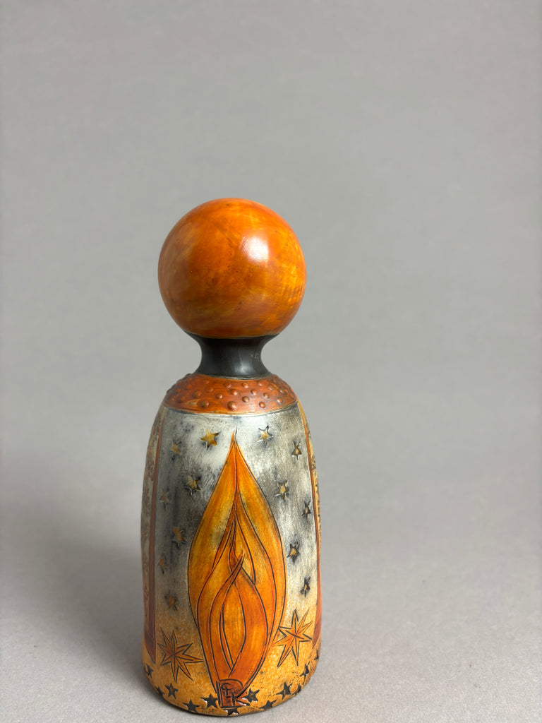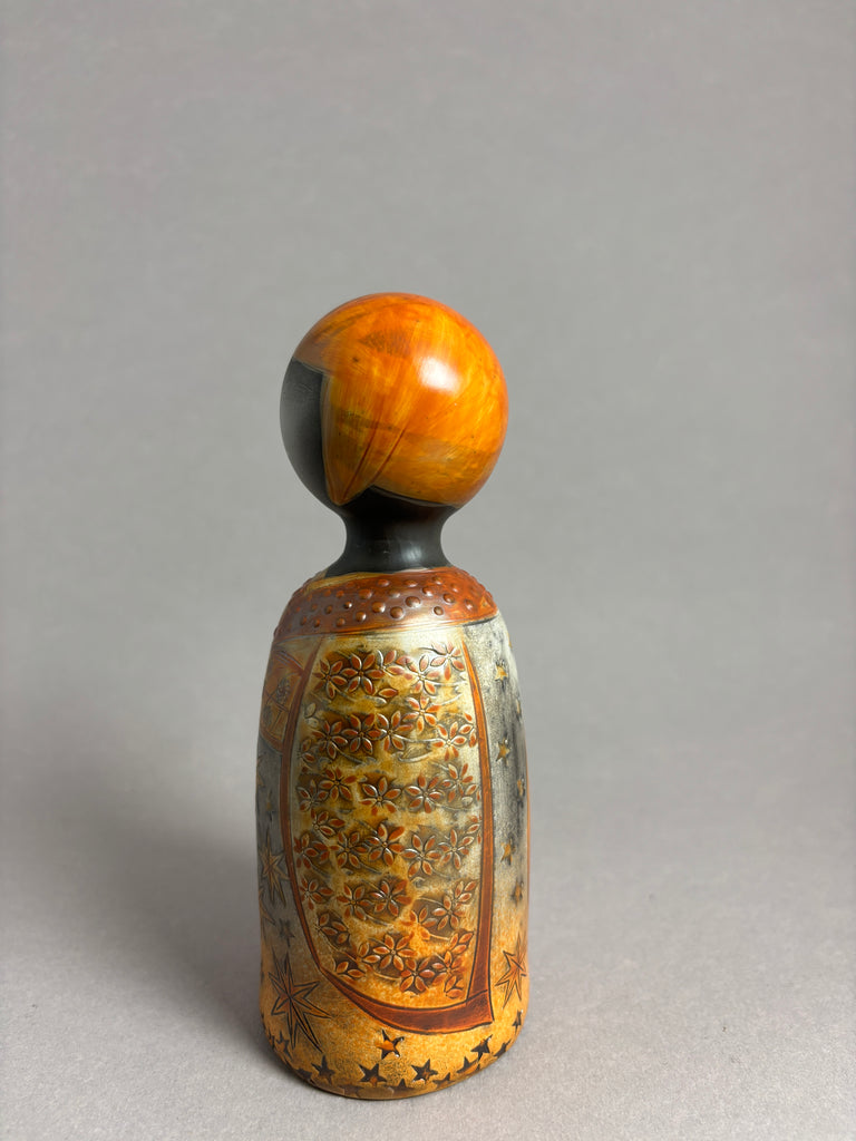 Description : Kokeshi kimono orange dégradé gris, col pois relief rouge. Motif asanoha (étoiles). Petites fleurs en relief sur les manches. Tête orange.
